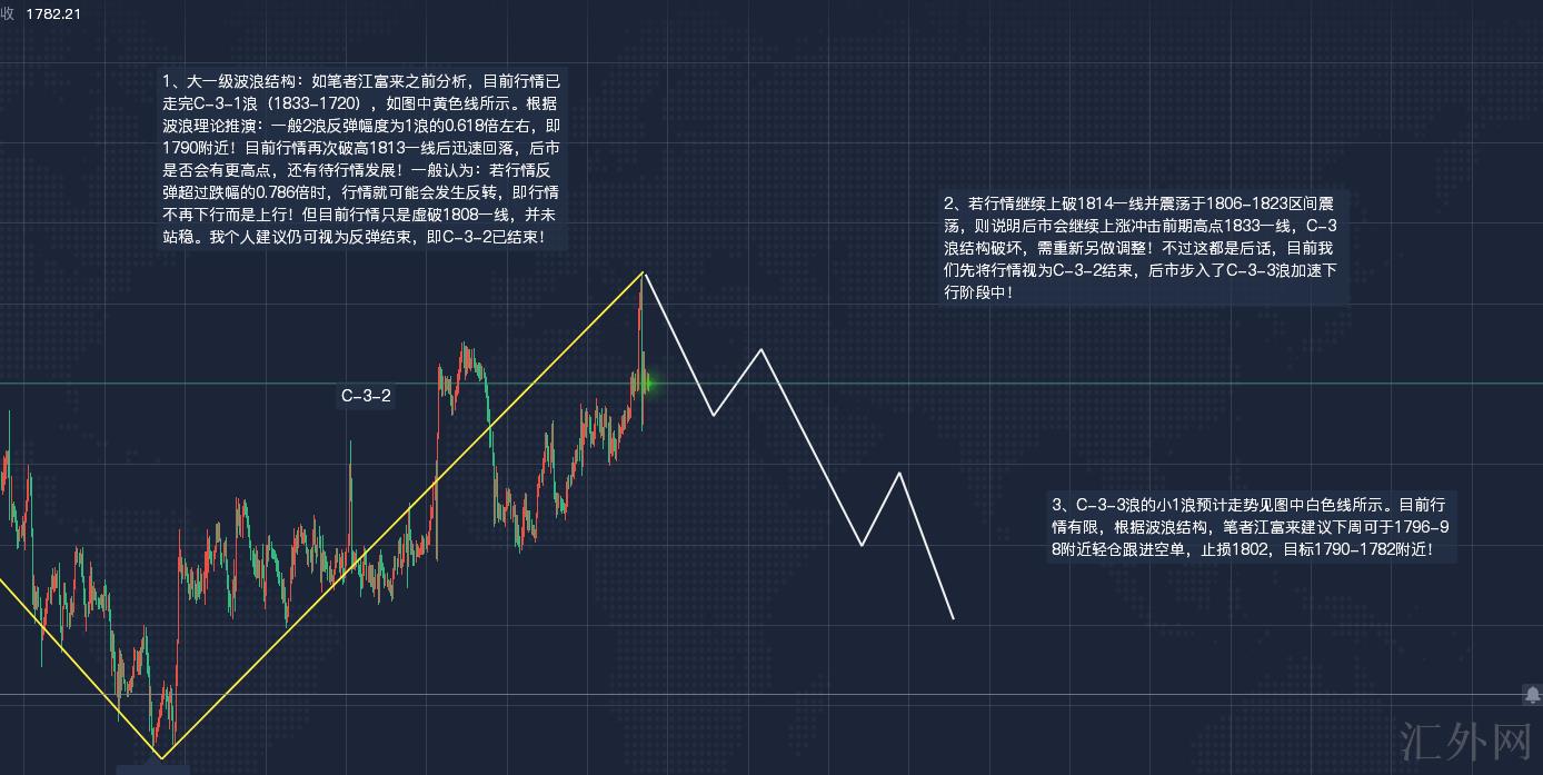 2、若行情持续往上击穿1814一线并震荡于1806-1823区间震荡,则表明后市会持续上升打击前期高位1833一线,C-3浪结构损坏,需从新另做调动!然而这均为后话,当前我们先将行情看为C-3-2终结,后市步入了C-3-3浪增速下探阶段中!