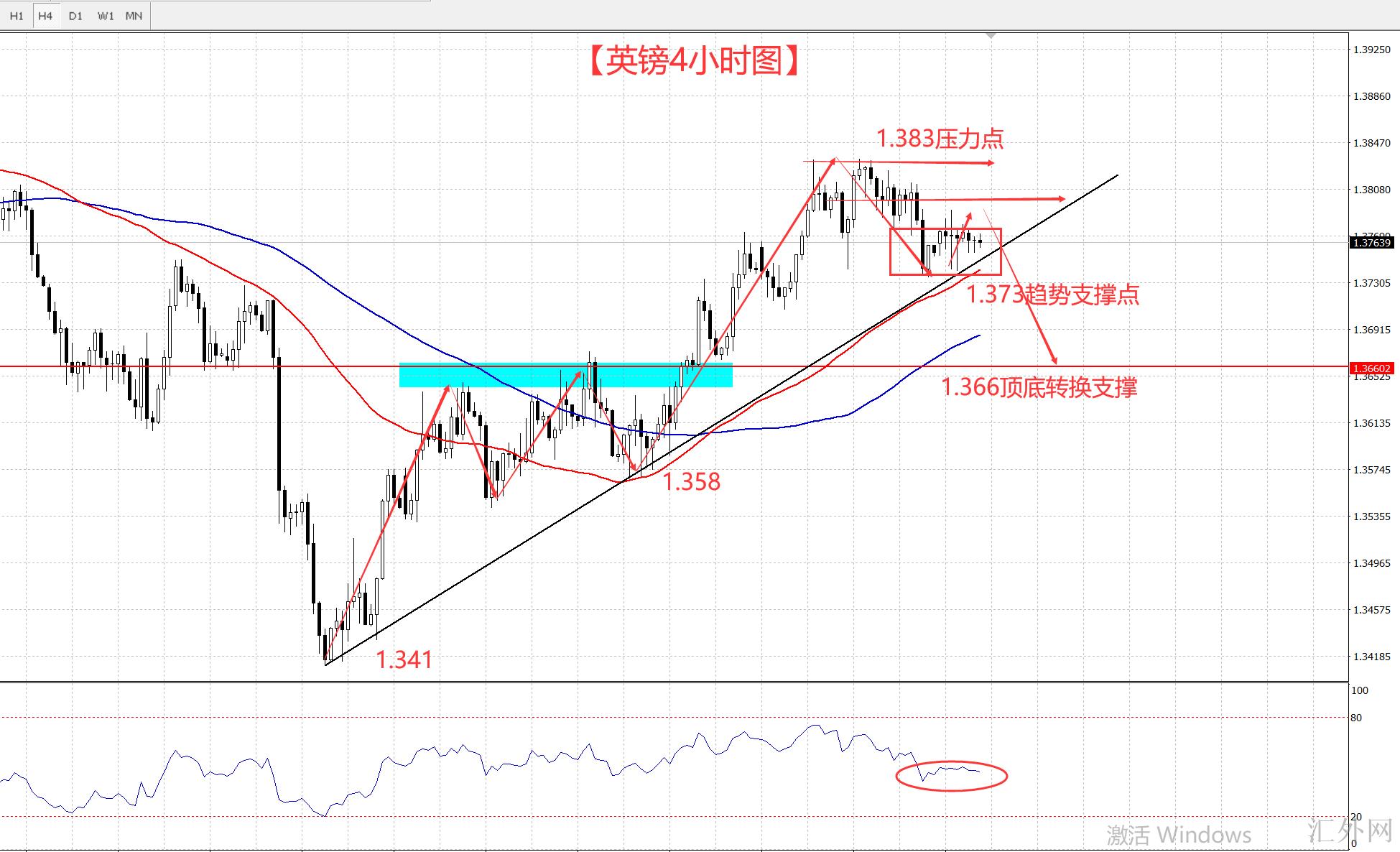 4小时图中来说,GBPUSD昨天一整天的时间,都在持续的试探来从1.341-1.358的上涨趋势线的支持上方,看似支撑很强,实则在虚张声势。首先,经历靠近一个月的回弹,两段推涨,最终没有顺遂的立稳1.383的上方,而且一直处在高点震荡,rsi指标亦在这段高点震荡中,从新回归50%的以下。也就是说英镑这段趋势一旦突破1.373的趋势支撑,面对的也就是一次增速下挫,以下将迅速试探1.366一线。