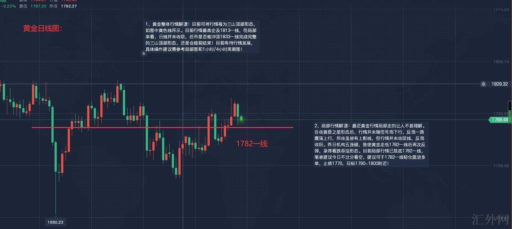 1、黄金整体行情注解:当前可将行情看为三山顶部形态,如图中黄色线所示。当前行情最高企及1813一线,但局部来说,日K线仍未收阴,后市能否能冲顶1833一线完成完整的三山顶部形态,依旧会提早终结!当前有待行情发展,具体交易参考需参考局部图和1小时/4小时周期图!