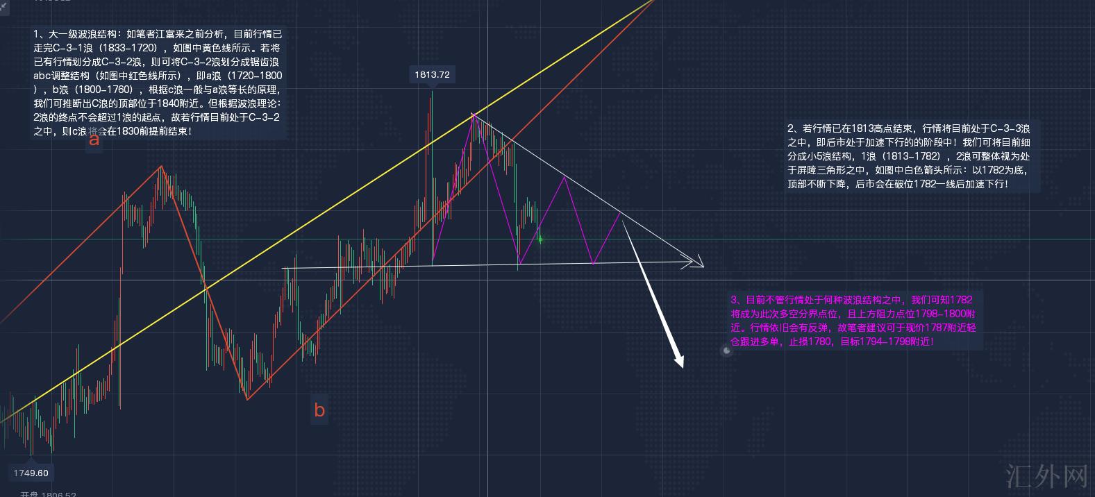 2、若行情已在1813高位终结,行情将当前处在C-3-3浪当中,即后市处在增速下探的的阶段中!我们可将当前细分成小5浪结构,1浪(1813-1782),2浪可整体看为处在屏障三角形当中,如图中白色箭头所示:以1782为底,顶部持续下滑,后市会在突破1782一线后增速下探!