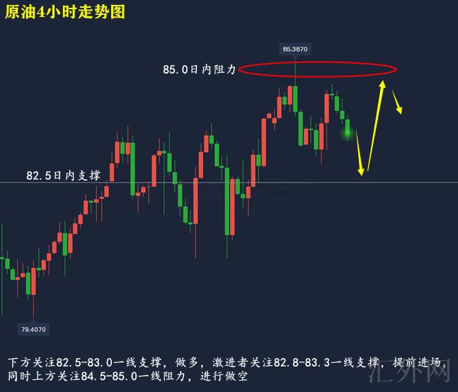 回撤82.5-83.0左右买涨,止损0.5美金,计划看84.0-84.5左右;激进派依托82.8-83.3一线支撑,提早进场;