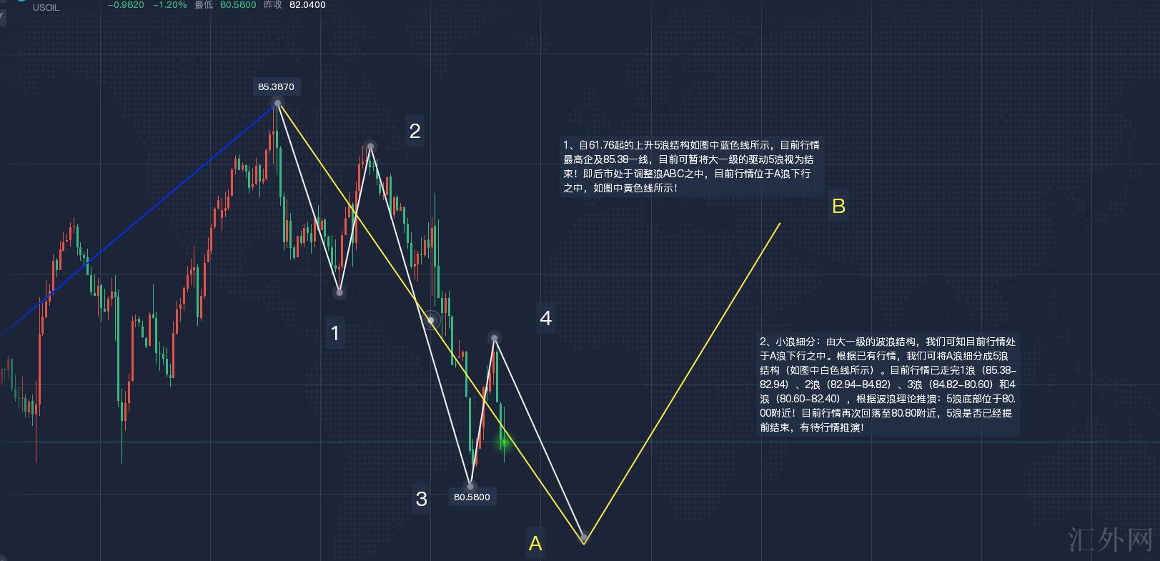 2、小浪细分:由大一级的波浪结构,我们可知当前行情处在A浪下探当中。依据已有行情,我们可将A浪细分成5浪结构(如图中白色线所示)。当前行情已走完1浪(85.38-82.94)、2浪(82.94-84.82)、3浪(84.82-80.60)和4浪(80.60-82.40),依据波浪理论推演:5浪底部位于80.00左右!当前行情又一次回调到80.80左右,5浪能否已经提早终结,有待行情推演!