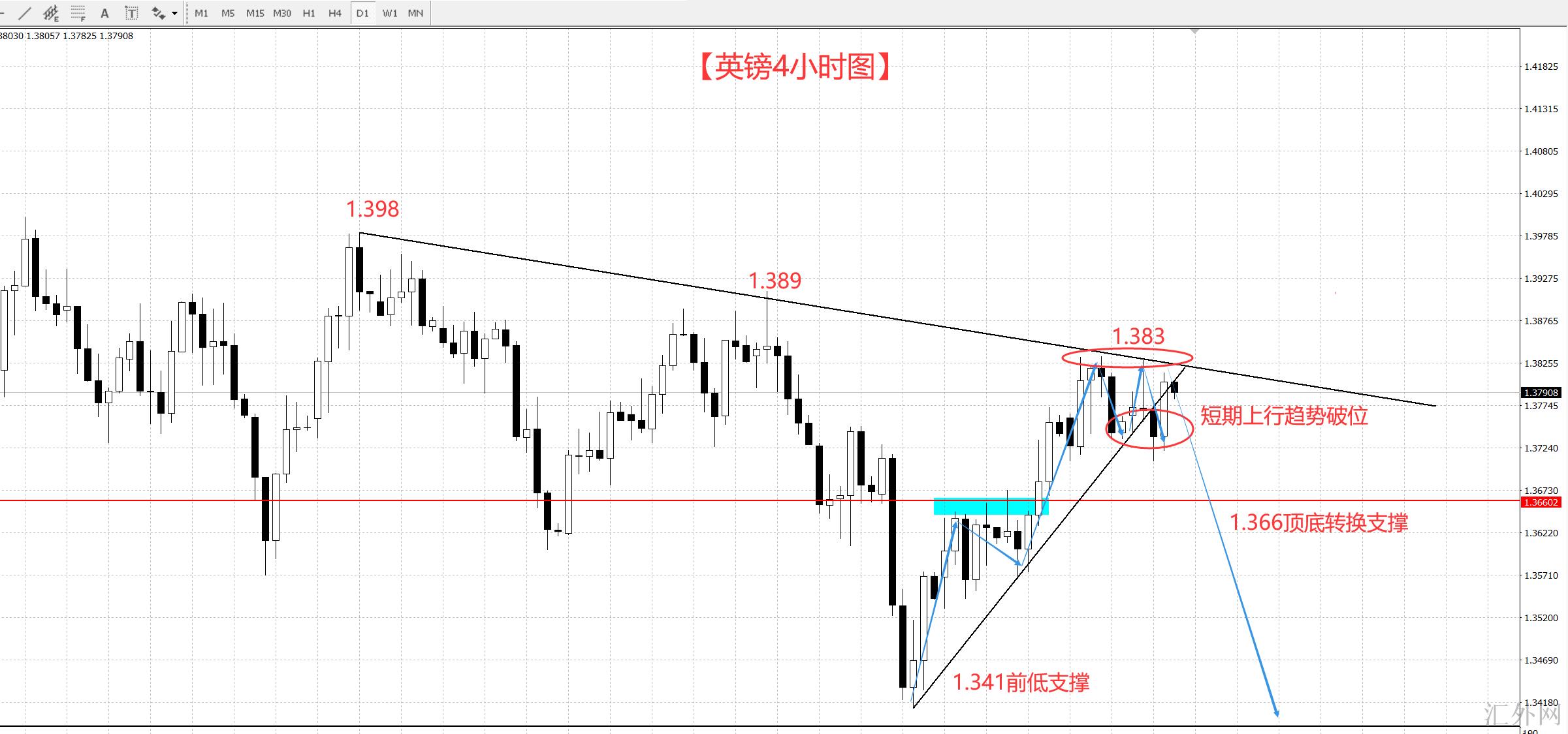 截至到迄今为止,英镑这周先后自周内高位1.383回调,随后是创下1.370的低位;隔夜又一次回归1.380左右,然而来自日K线1.398以来的下探趋势并没有击穿,以下尽管没有击穿1.370的支持,但是两次试探击穿1.373,已经表明了以下支撑的松动,接下去无非就是等候新一次下跌趋势的开始,以下注意来从1.373和 1.366的支持。