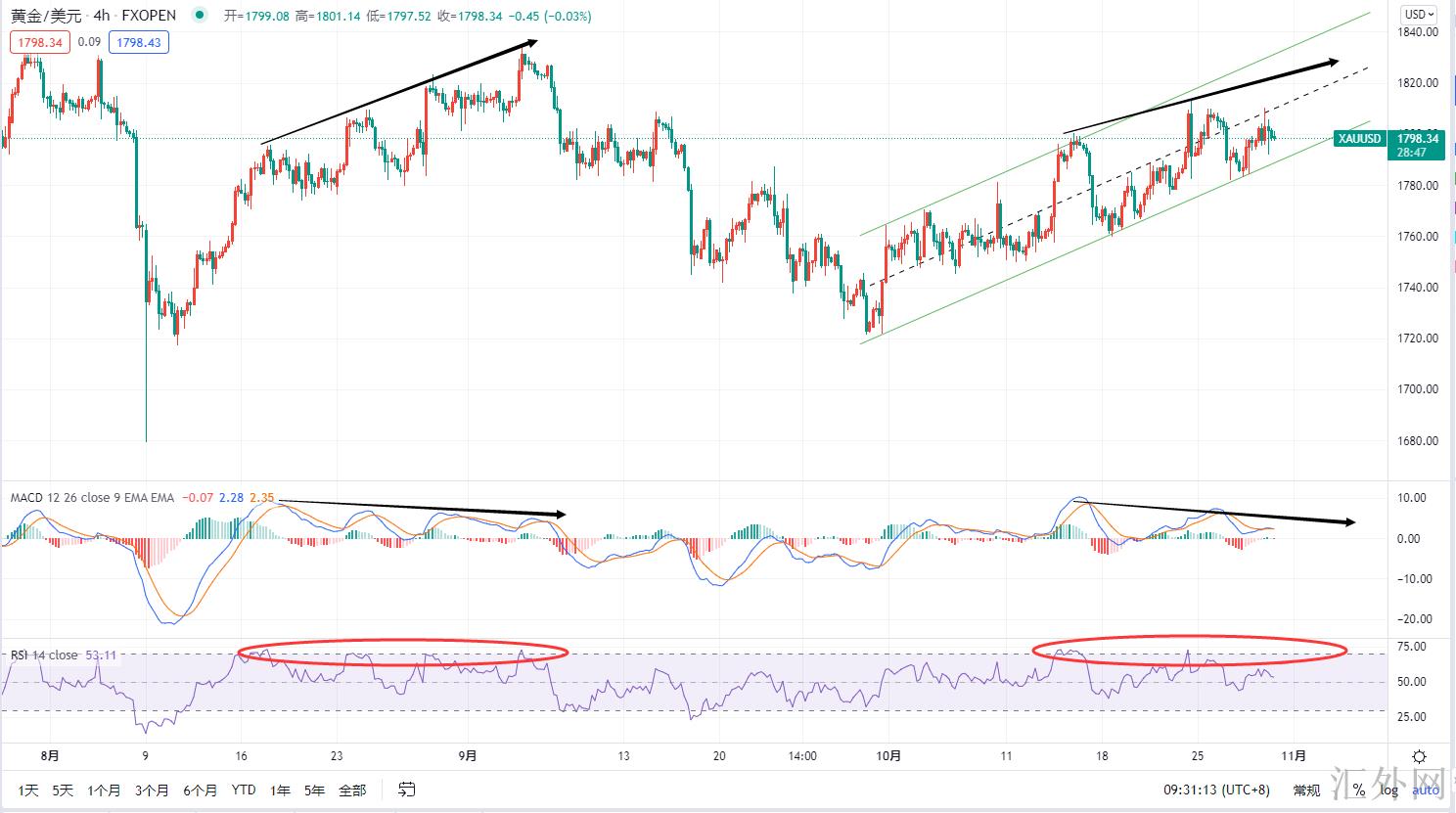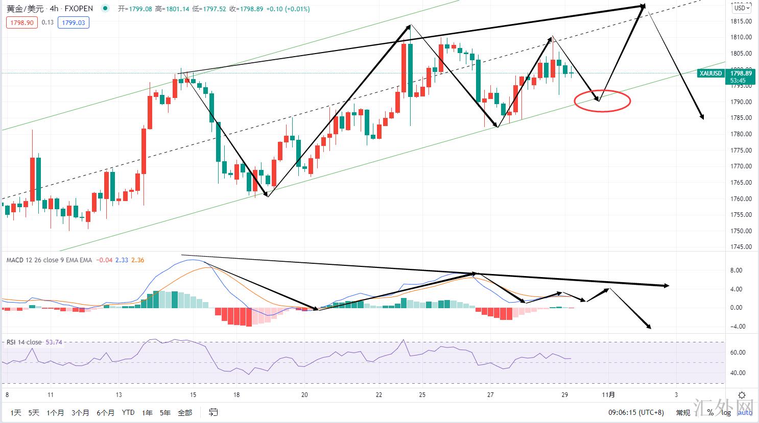 这周的最后一个交易日,这周黄金差不多是环绕着1800上下震荡,1800这个整数关键点位毫无节操,从形态上来说,行情是环绕着4小时级别的顶背离在走,所有的行情震荡均为在走顶背离,不管是一次顶背离依旧多次顶背离,不可否认的是,黄金是在走顶部形态,后市的下挫无可避免,尽管当下行情异常曲折,但是将来异常光明,依我看来,当前是没有操作必要的,研究MACD背离多年,我从刚开始的背离中的每一波行情都要参与渐渐演变成只做最后一次,这首要是出于对控制风险的斟酌,我在等候日K线给我显著的信号进场做最后一击!