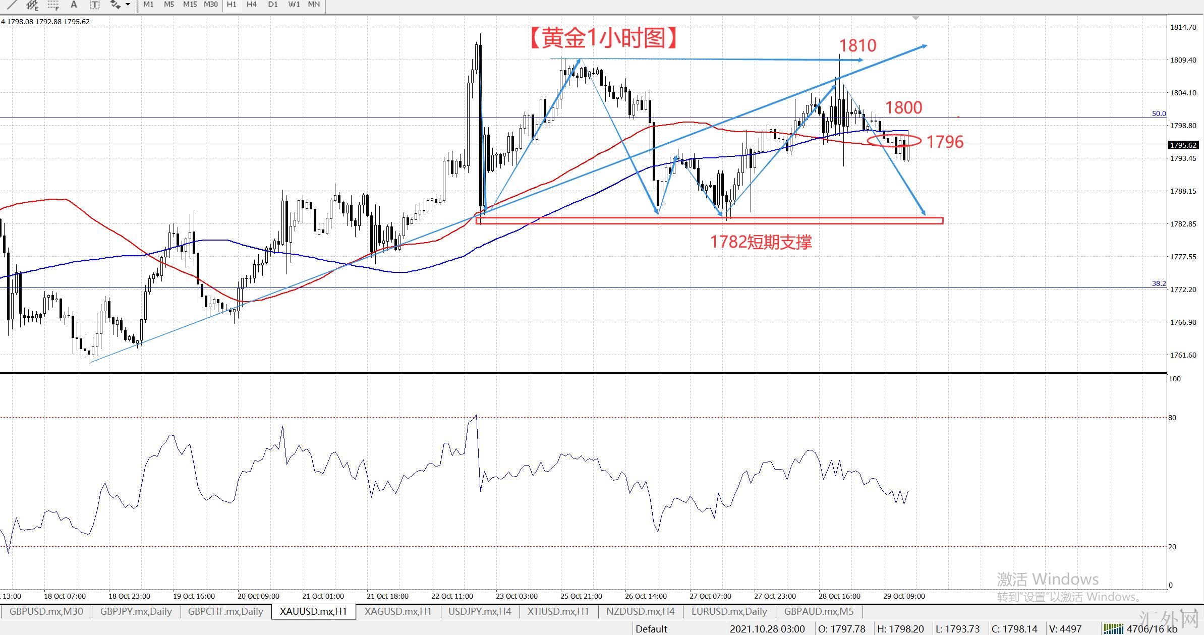 当前来看,基本分析有着美联储缩债和加息做后盾,无非就是今天通货膨胀报告对行情导致很大的不平稳性,技术分析当前在试探1810后面,并没有又一次试探1782,这也就给今天的短线交易导致了机会。