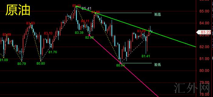 回弹在83美元遇阻下探,日K线周期上跌穿短时间均线,这代表着上升后面开放调动,后面会有一个高点反复震荡的过程。形态已经从强劲单边转入到震荡修正,后面主体趋势会作出选择,是修正终结持续走买方,依旧走弱下探,全将有不错的布局机会,着重留心。短线日间行情就是区间震荡,下周支撑点置在81美元,刷新买涨,止损80.40,计划看82。