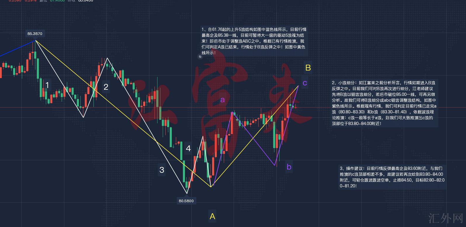 3、交易参考:当前行情回弹最高企及83.60左右,与我们推演的c浪顶部相差不多,故推荐若又一次给到83.80-84.00左右,可轻仓跟进跟进空单,止损84.50,计划82.80-82.00-81.20!