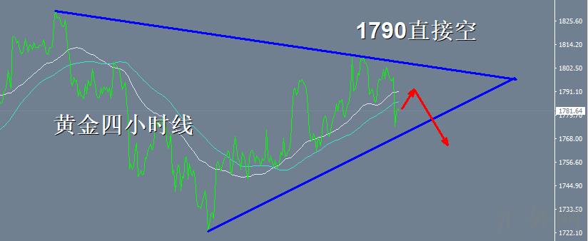 黄金四小时线k线直接被中轨抑制,k线运行于布布林带中轨以下,被摁在地板上冲突,k线直接在地板上趴着,布林带轨道也是显著的朝下开口,开口持续加大,当前没有掉头的痕迹,50均线以及80均线显现朝下运行的轨迹,上方压力位1790一线铜墙铁壁般存在,空,回弹1790直接空