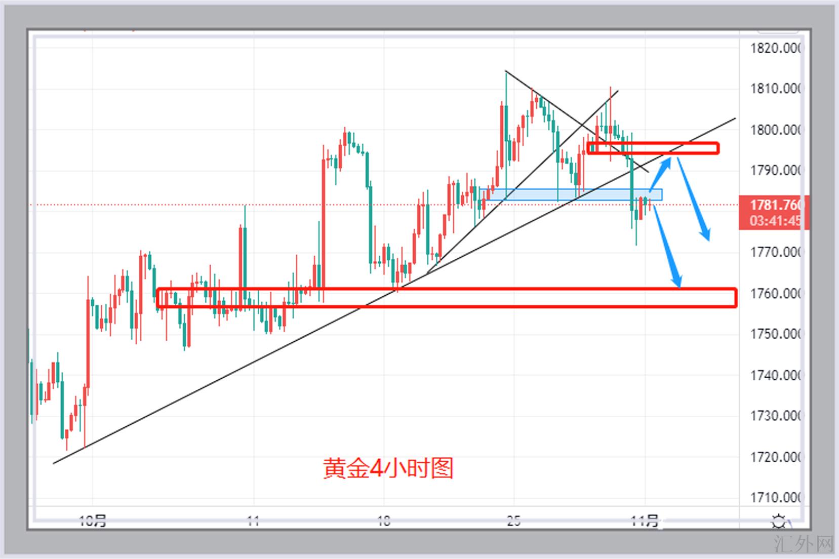 刚才已经提及了黄金的确在上星期五显现了适当的朝下击穿情形,核心的上涨趋势线也被跌穿,但是我们看黄金整个10月份的上涨均为根据1760-1750区域的支持点置而开始,所以,即便黄金上星期五显现了短线的朝下击穿情形,但对黄金整个10月份上升的底层活力来讲并没有形成突破,黄金多空力量也并没有发生根本性转变。