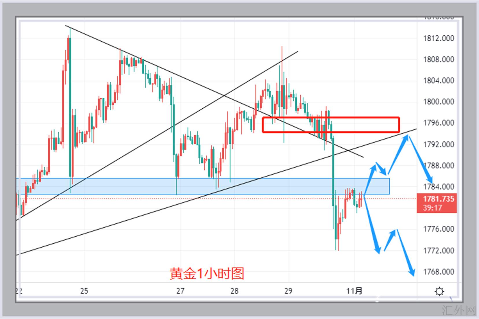 此外的一个空单进场位置就是,上星期五黄金显现急速下挫的的起跌点1792-1795区域位置,这个位置疑似距离9月30号迄今上升趋势线朝下击穿后近期的回测区域。