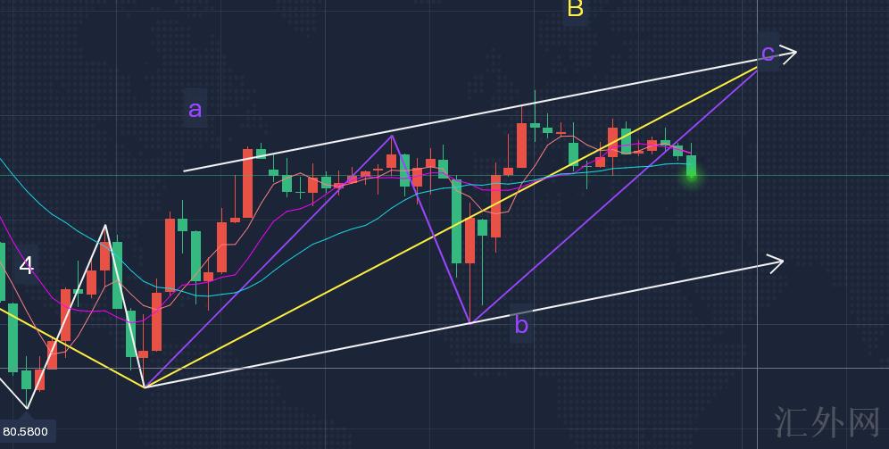 波浪结构分析:由早间分析我们可知,当前行情处在B浪回弹当中,且暂判定B浪可细分成锯齿浪abc浪结构,如图中紫色线所示。当前可将行情看为a浪(80.80-83.26)和b浪(83.26-81.40)均已走完,行情处在c浪回弹当中。依据波浪理论:c浪一般等长于a浪,且a浪起点和b浪终点所构成的趋势线常常平行于a浪终点和c浪终点连接而成的直线(如图中白色箭头所示)。故我们仍可先看涨后看跌,顶部可先目睹83.80-84.00左右,需依据具体信号而定!