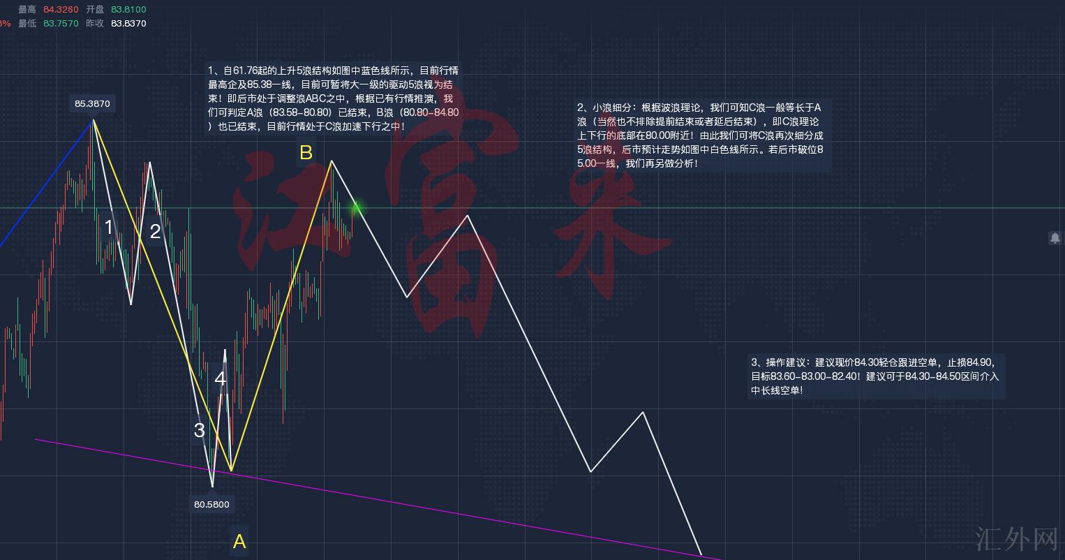 1、从61.76起的上涨5浪结构如图中蓝色线所示,当前行情最高企及85.38一线,当前可暂将大一级的驱使5浪看为终结!即后市处在调动浪ABC当中,依据已有行情推演,我们可判定A浪(83.58-80.80)已终结,B浪(80.80-84.80)也已终结,当前行情处在C浪增速下探当中!