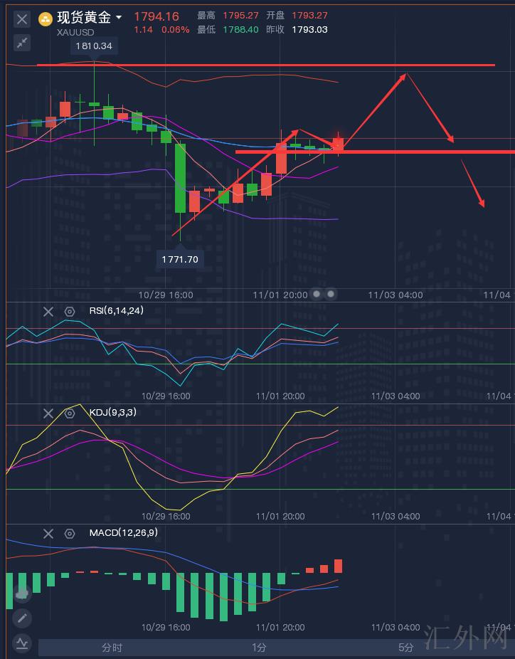 星期二(11月2号),金融市场维持平稳。受乏力美国核心报告打压,美元指数在星期一遭挫,失守94关键点位,当前持续遇阻于93.90附近;黄金现货星期一明显回弹,收盘在1790美元每盎司上方,当前交投在1795美元每盎司附近,黄金买方短时间计划瞄准1815美元左右。然而有龚关铭觉得,本星期三美联储货币政策会议或许使黄金价格面对下探风险。