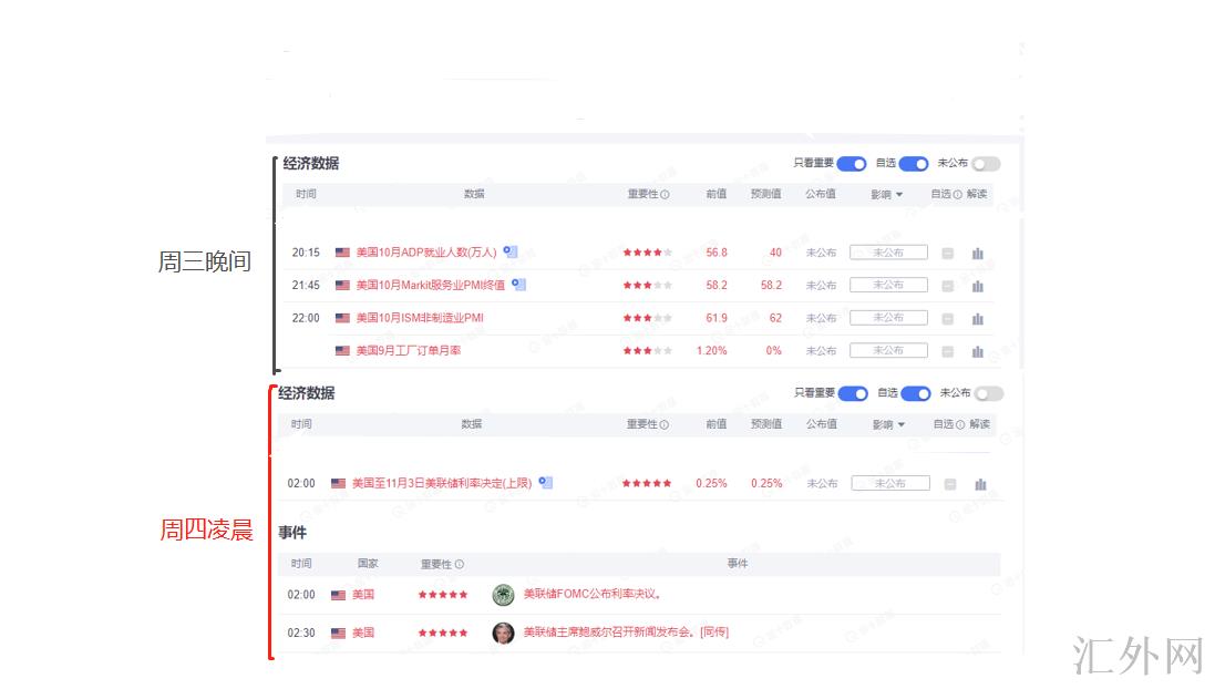 在美联储利率会议前,市场也会面临一揽子经济报告,报告层面需紧密关注夜里8:15美国10月小非农就业人口表现,尽管以往几个月的报告表明,小非农的报告与非农就业报告显现了显著的分裂,但它仍可为星期五非农供应指导性作用,市场预期小非农就业人口将令增长40万人,差于前值的58.2万人。