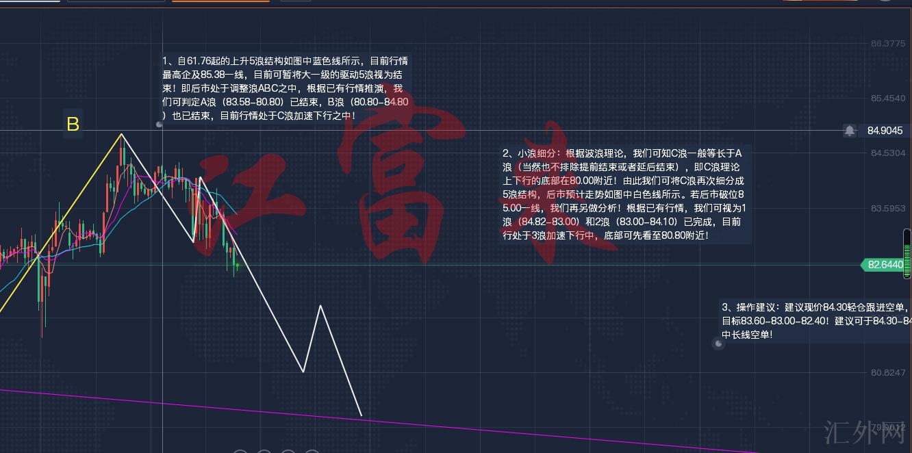 1、从61.76起的上涨5浪结构如图中蓝色线所示,当前行情最高企及85.38一线,当前可暂将大一级的驱使5浪看为终结!即后市处在调动浪ABC当中,依据已有行情推演,我们可判定A浪(83.58-80.80)已终结,B浪(80.80-84.80)也已终结,当前行情处在C浪增速下探当中!