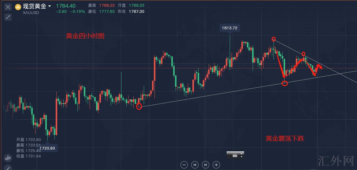 黄金从短周期来说,当前走收敛三角,今天凌晨有美联储利率行情,形成短时间行情转换的核心。夜里预期有波回弹,回弹到趋势线以下,我们可以买跌黄金,4小时图来说,黄金处在震荡下挫的行情、