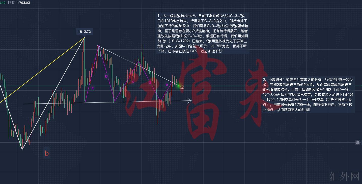 2、为何强调1782-1784这一区间压力?1782-1784这个区间,当前最差不多1个月均为环绕这个区间展开,或作为支撑或作为压力。所以这个区间的单量是比较集中的,当前仍有多单连续持续入场,所以致使多空仍胶着。从整体上来说,此处支撑的力度是大于作为压力的力度的(支撑5次,压力2次,一次压力击穿),所以也可以解释为何突破了1782但行情仍横盘1780一线。但抛支出撑和压力,从波浪和裸k信号来说,整体行情是处在下探趋势。波浪结构已完成屏障三角形调动浪结构,裸k圆顶形态按计划下探,且RSI仍未呈现底背离态势。所以我当下仍不看空顺势空单,若行情突破1772一线,后市将导致多单止损,进而导致恐惧性抛压!
