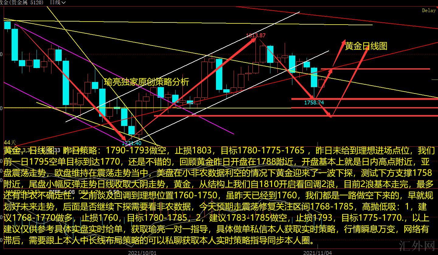 黄金,日K图,昨日策略:1790-1793买跌,止损1803,计划1780-1775-1765 ,昨日未给到理想进场点位,我们上一日1795空单计划到达1770,依旧不错的,回顾黄金昨日开盘在1788左右,开盘差不多就是日间高位左右,早盘震荡行情,欧盘保持在震荡行情当中,美盘在ADP报告有好处空头的情形下黄金面临了一次下探,试探以下支撑1758左右,收盘适当回弹行情日K线收取大阴行情,黄金,从结构上我们从1810开放看回踩2浪,当前2浪差不多走完,最多仍有非农未知性,以前谈到回踩到理想位置1760-1750,虽昨天已经到1760,我们均为一路买跌下来的,早就规划好将来行情,后面能否持续下探需求看非农就业报告,今天预计走震荡修复关注区间1768-1785,高抛低吸:1,推荐1768-1770买涨,止损1760,计划1780-1785,2,推荐1783-1785买跌,止损1793,计划1775-1770.,以上推荐仅供参考具体实盘实时给单,获取瑜亮一对一指导,具体做单私信本人获取实时策略,行情瞬息万变,网络有落后,需求跟上本人中长线布局策略的可以私聊获取本人实时策略指导同步本人圈。