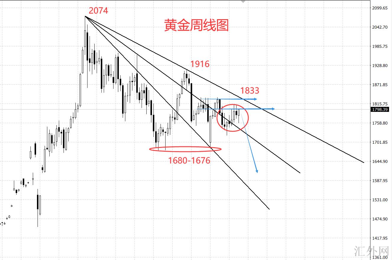 然而假使黄金又一次收回1800,那性质就稍微不太一样了,周线图中可以显著目睹一个现象,那就是黄金在近期的几周的行情种,是上也上不去,下也下不去,从去年8月份的下挫以来,一直处在扇形下挫趋势当中,前两周的时间一直遇阻于1810,上周更是给出了显著的到顶信号,然而市场疑似不不愿意就这么让黄金跌下去。