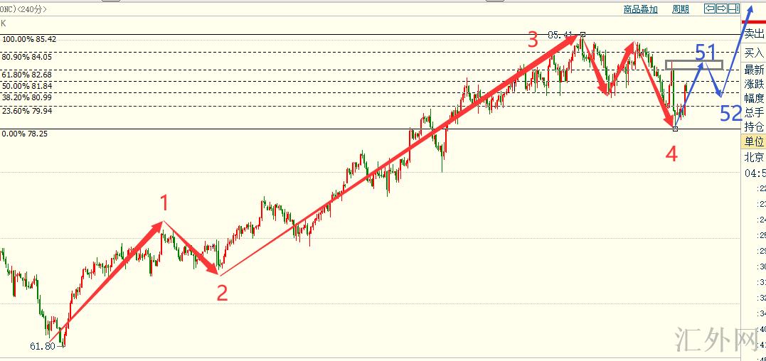 复盘结构:85.40开始的4浪调动已经显现完整的三轮结构,同期整体的回调程度也已刷新黄金分割38.2%一线的支持78.60,尽管略有虚破但属于正常现象。当前看从78.40开始的上涨也会连续,当前大约率处在最后的第5浪上涨阶段,假使持续细分则处在5浪1当中仍未运行完毕,下周上涨到83.00一线需求着重关注,假使买方无法强劲往上击穿代表着将面临短时间的回调调动5浪2。