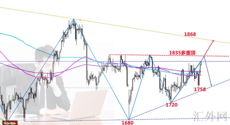 黄金非农周受报告层面影响反复过山车洗盘,ADP小非农冲顶大幅回调,非农大幅有好处空头却强劲推涨,最终击穿1800关口与1814前高点置,买方如虎添翼直逼1820关键点位,上涨趋势尤为惊人!从目前行情来说黄金已经创下最近高位买方势如破竹,看多情绪一片高昂!日K线两连阳推涨MA5—MA10均线保持金叉上涨,布林带上缘已经有往上开口态势,MACD红柱能开始放量;周线局势也是相当有助于上涨趋势,下探回涨收尾动员短时间均线金叉上升。技术分析依旧不看空买方更深一步上升,有希望试探1835这个多重顶密集压力区,此位置会是核心的核心,前期多次打击此区间显现大幅回调,形态上保持在三角形震荡整理,若是本轮击穿1835这个核心位置,那么黄金将要一飞冲天增速上升,反之则又一次遇阻回调。从个人角度来说当前依旧不看空冲顶回调,毕竟此波推涨到当前位置世界ETF持仓量并没有显现增持的现象而是持续坚持,这个信号告诉我们市场并没有是很不看空黄金持续上升的活力,若是依据1835—1680这个区间规律来说,依旧有冲顶回调风险。短时间操作我们依旧顺势而为,以回踩入多为主,以下回踩1810左右是今日核心支撑,上方注意1830—1835压力区即可。
