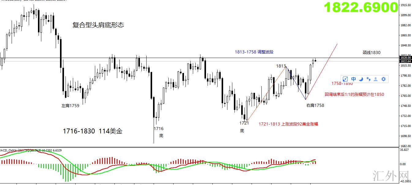 日K线当下底部的形成,单边上升趋势的到来,仅差临门一脚的证实。着重关注证实信号即可,上方初始上升计划1850,中期上升计划1939.