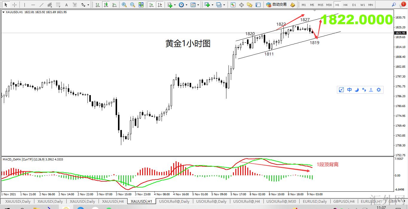 短线1小时中,自刷新1820后面,黄金价格便开始了震荡上升,持续适当的创下高峰,而且形成了一个窄幅的上涨通道,当前k线运行在通道中,通道下缘支撑在1819,此位置是日间斟酌的初始支撑买涨位置,同期4小时的顶底转换位亦在此,若4小时实体朝下击穿1819,则表明从1758到1827的4小时上升终结,将要进入回踩阶段,在上升结构完整以前,保持看多思路,但是需求注意的是,当下行情表现出上升疲软的现象,首要是因为于1小时在昨天高峰后形成了1段的顶背离现象,但是因为于4小时仍有适当的买方量能,所以行情一时半会也不会痛跌,对于该种情形,若今天在1819左右接多行情按计划持稳,则需求注意高峰后退场,1728-1730区间。