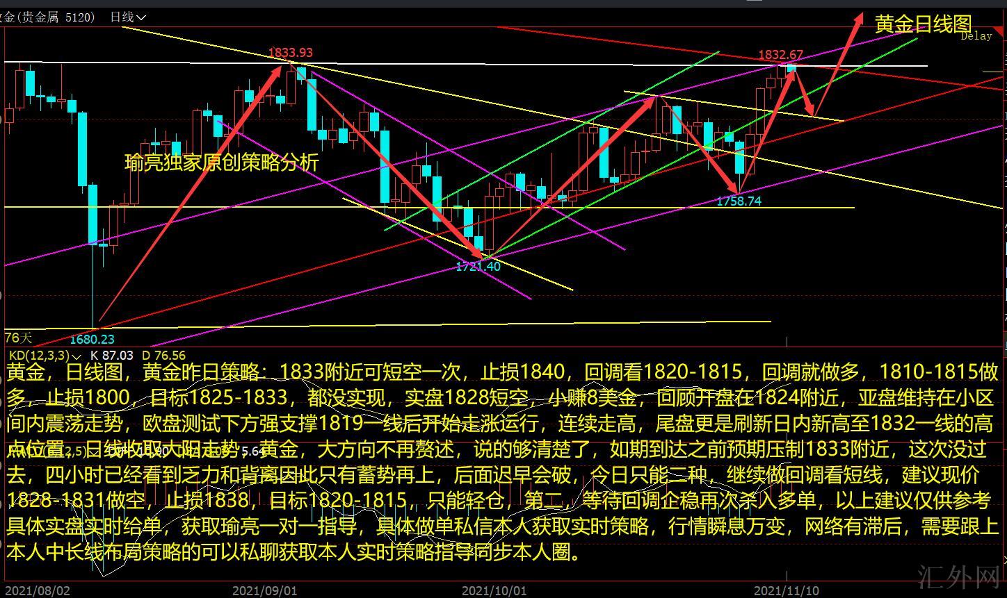 黄金,日K图,黄金昨日策略:1833左右可短空一次,止损1840,回踩看1820-1815,回踩就买涨,1810-1815买涨,止损1800,计划1825-1833,都没达到,实盘1828短空,小赚8美金,回顾开盘在1824左右,早盘保持在小区间内震荡行情,欧盘试探以下强支撑1819一线后开始走涨运行,接连上升,收盘更是创下日间高峰到1832一线的高位位置,日K线收取大阳行情,黄金,慷慨向不再赘述,说的够清楚了,按计划到达以前预计抑制1833左右,这次没以往,四小时已经目睹疲软和背离所以只有蓄势再上,后面迟早会破,今日只能二种,持续做回踩看短线,推荐现价1828-1831买跌,止损1838,计划1820-1815,只能轻仓,第二,等候回踩持稳又一次杀入多单,以上推荐仅供参考具体实盘实时给单,获取瑜亮一对一指导,具体做单私信本人获取实时策略,行情瞬息万变,网络有落后,需求跟上本人中长线布局策略的可以私聊获取本人实时策略指导同步本人圈。