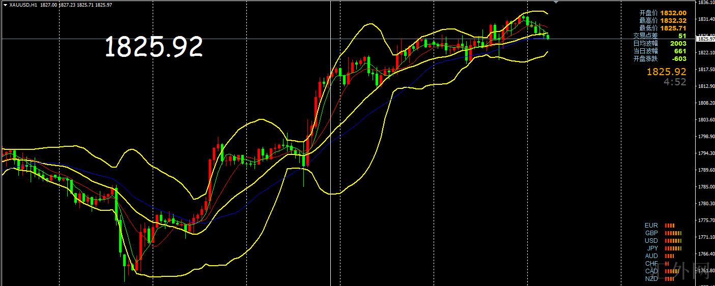 昨日黄金日K线持续收阳,但是强度在渐渐减小,日K线四连阳,买方的区域依然仍在连续增大,但是今日早间开盘1831左右,短暂下挫,下挫的强度不大,但是仍存在回弹的痕迹,买方持续攀升,MA5上拐的程度加大,今天行情仍有更深一步下挫的区域,MA10与布林带中轨并排攀升,但是攀升的开口并没有加大,上升的泡沫过大,行情仍需有连续回撤1810左右后,才可打开新的局势,四小时层面来说,布林带有收口的持续,上升的强度被缩减,MA三根均线拐幅不大,所以,今天整体的方向来说,操作上推荐回调买涨为主,回弹高空为辅。上方压力注意1835-1840,以下支撑注意1808-1810.
