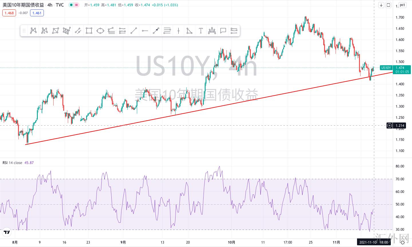 此外就是美国十年期美债收益率,技术分析分析美债收益率短时间内是回踩下挫到了趋势线左右,结合长期行情来说十年期美债收益率也是呈现上升的趋势。回到到小周期来说显然十年期美债收益率是处在四小时级别的趋势支撑线上的,所以分析踩到支撑后,收益率将令持续上升。那么对于黄金交易市场的直接影响就是有好处空头黄金价格。美债收益率的下挫,代表着投资人在抛压美债,表明市场避险情绪减退,从而有好处空头黄金价格,致使黄金价格下挫。