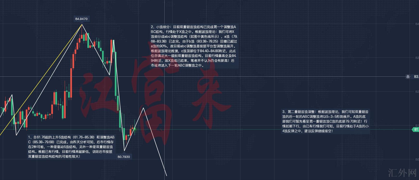 2、小浪细分:当前双重锯齿浪结构已完成第一个调动浪ABC结构,行情处在X浪当中。依据波浪理论:我们可将X浪细分成abc调动浪结构(如图中黄色线所示),a浪(79.68-83.38)已走完,受于b浪(83.38-78.25)回撤已逾过a浪的90%,故当前abc调动浪是依照平台型调动浪展开。依据波浪理论推演,c浪顶部位于84.40-84.80左右,此点位亦满足大一级别双重锯齿浪结构。当前行情最高企及84.94左右,故X浪或已终结,笔者并没有觉得仍会有高峰!后市恐会进入下一次ABC调动浪当中。