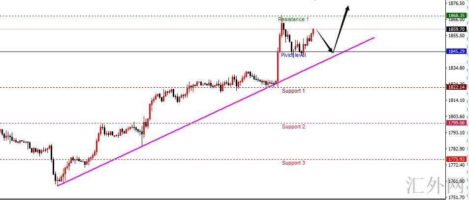 实话实说,小的支持阻力位当前的确不好预期,昨天极限推涨后今天很或许要先走一次震荡,那么1862和1840就是一个异常重要的区域高低位。然而对于稳健的投资人可以等夜间美盘回调持续跟进多单。毕竟顺势做,风险总体会比较小,假使后市持续击穿1868,可以往更好点位去跟进。