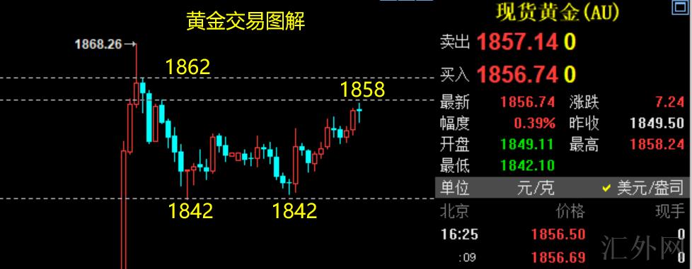 早盘时段回踩隔夜低位1842左右支撑后上升,现报价1856;4H图排列看多,但因隔夜从1868回撤程度较大,预计不会直接拉高而是转震荡;短线压力1858,强阻1862;短线支撑1852,强支撑1850-1848-1842;