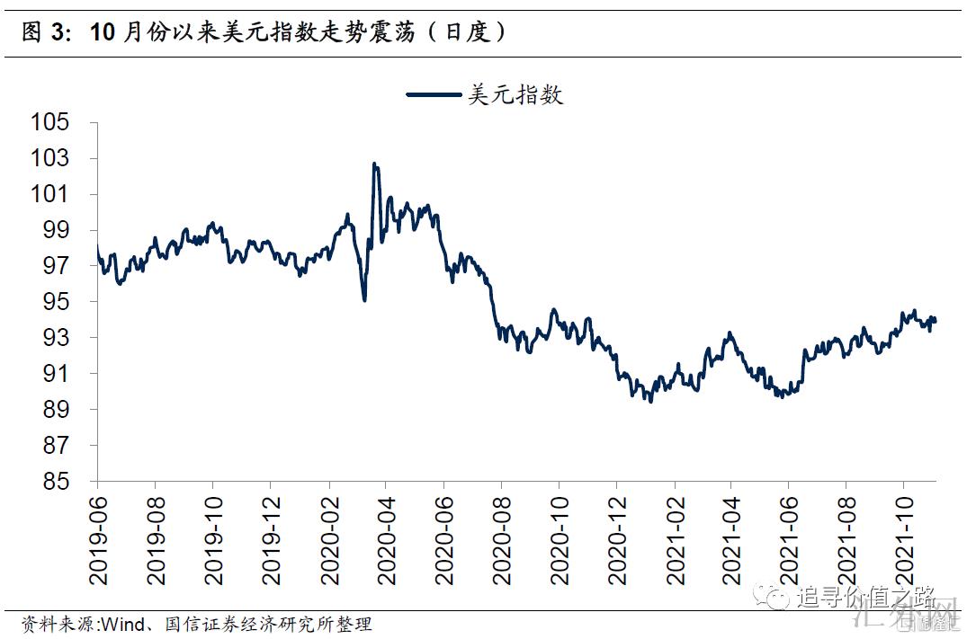 美元指数:10月份以来美元指数行情震荡。截到11月3号,DXY美元指数为93.9,10月平都是94.0,总的来说,10月份以来美元指数行情震荡。从改变趋势来说,去年流行病暴发以来,美联储执行了十分宽松的货币政策,致使美元指数显现了趋势下探,今年上半年我们目睹在经济恢复、通货膨胀持续上涨的环境下,美联储事实态度任然多转鸽派,所以美元指数总的行情较为震荡。11月4号,美联储发布利率会议,保持联邦基金计划利率在0%-0.25%不变,并显示本月中旬起将每月降低150亿美元的资产买入范围,预期将在2022年中期终结购债,Taper正式落地。然而后面的新闻公布会上鲍威尔强调Taper并没有代表着加息,态度任然较为鸽派。