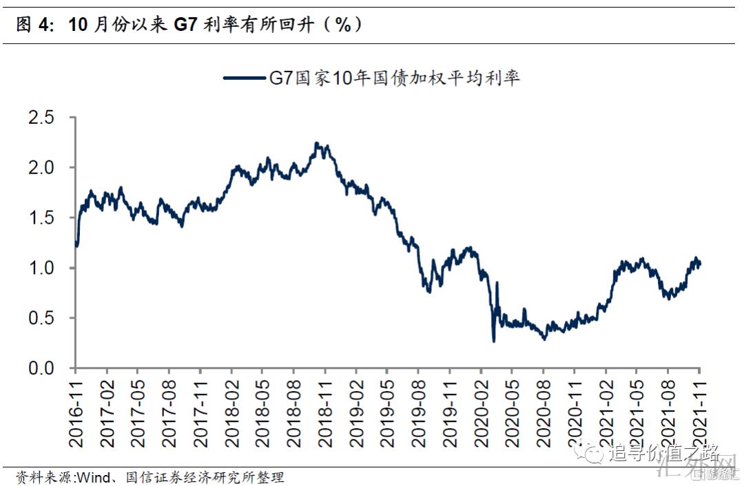 G7国家十年期国债加权平均利率:该利率是以G7国家的国内生产总值为权重计算十年期国债加权平均收益率。截到11月3号,G7国家十年期国债加权平均利率为1.05%,上个月平都是1.03%。从改变趋势看,世界加权平均利率在2018年11月份高达高位后开始趋势下探,而2019年10月份开始显现了阶段性的回弹,然而去年受流行病影响,2020年1月下旬以来G7加权利率再次大幅下探,而去年下半年来伴随经济恢复持续加深,G7利率也开始自底部震荡回涨,在今年二季度末高达阶段性高位后G7利率开始回调,然而9月份以来伴随美联储、欧中央银行等一部分海外中央银行态度货币政策将有所趋紧,G7利率同样有所回涨。