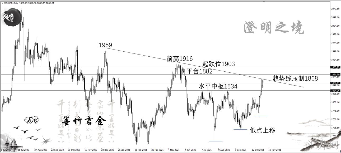 在此之前黄金在1834以下修正了四个月,如果黄金击穿现在区间整理更深一步攀升到1900上方达到摸顶,我觉得到顶后黄金将显现1—2个月的区域调动行情,在时间的过分中,短周期布局会有3—4段的规划(平均每段40美元),所以我对后面的行情异常期望!