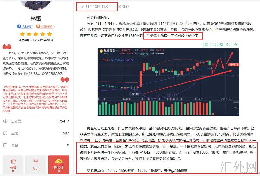 11月12号星期五美盘前我在汇通财经发表文章,注意美盘前行情有下挫回踩的需求,亚欧盘走跌是给美盘上升供应空间需求,这周黄金达到了五连阳,黄金短时间保持在1840一1865这个小区间震荡,在没有打破这个区间时我们高空低多操作即可。