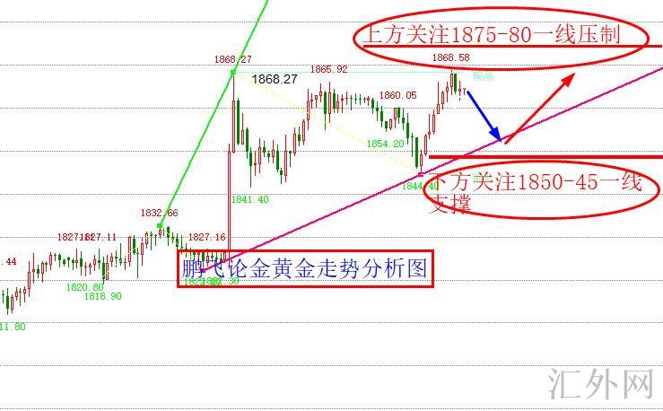 现阶段行情,差不多维持10美金为台阶即可,现阶段1860持稳不了,那么又一次突破1850的风险加大,差不多要看1845-40区域,假使这里持续失守,那么黄金买方的局势就会损坏,注意加大回撤强度,假使暴跌下来,依旧有不少机会可以去买涨的,毕竟前期连阳期间,星期五崩盘暴跌的几率不大!操作上来说,假使看跌,就不要在期望1865上方位置,就算适当给到1863还将迅速下来,如此才符合卖方调动的局势,以下1840突破差不多要看1835-30区域,也是前期二次上涨的底部区域!综合来说:下星期一黄金交易参考上鹏飞论金推荐以回弹买跌为主,回踩买涨为辅,黄金上方的压力先注意1875-1880区域左右,以下的支持注意1845-1850左右。