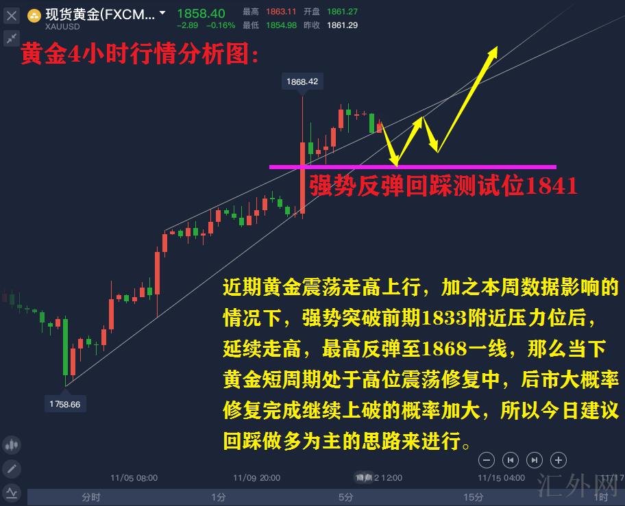 综上所述:第一,周K看遇阻1890的阻力位置;第二:日K临时连续看多,1860到1890仍有30个点的区域。第三:日K临时依旧看多,倾向走9连阳。第四:4小时倾向上连续击穿。