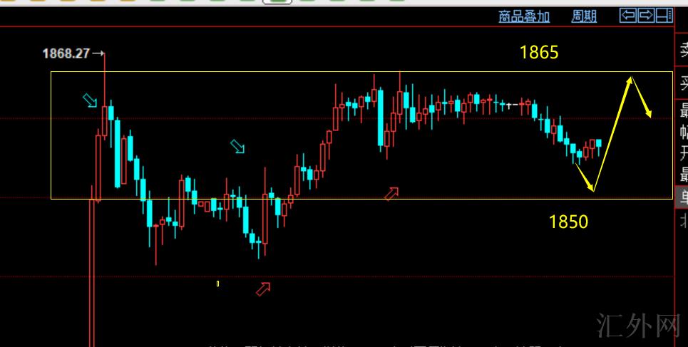 一小时上涨局势中继,日间五分钟级别走了一次调动,夜里最低摸底1845价格后走强,目前击穿1855价格后,构筑底部形态。星期一开盘回踩可持续多。