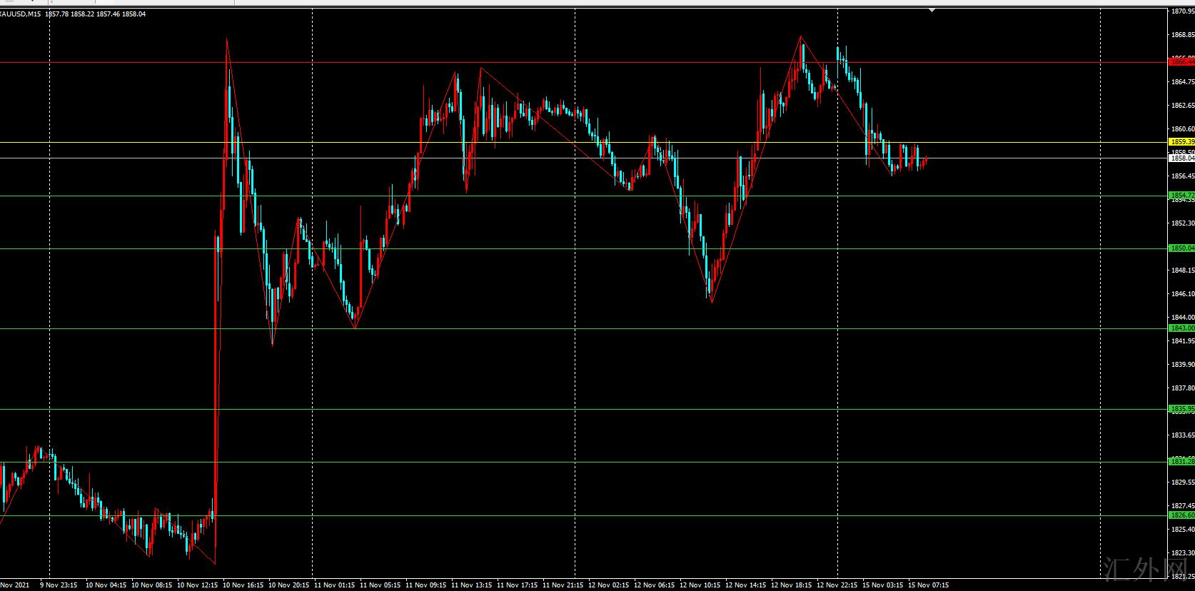 上周由于美国10月零售销售报告比较耀眼,以及上周的通货膨胀报告刷新30年迄今高峰,黄金直线立住1860上方,最高刷新1868.73美元,星期五因收周线,给到提示黄金只要持稳在1840上方,则持续看前高左右。不出所料,星期五黄金在密歇根指数出来后面,持续强劲上升。
