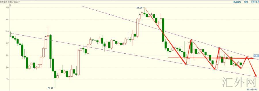 原油从日K线级别看当上周顶部收出穿透破脚的K线组合后,接下去的几个交易日都收出了阴线,致使价格下破了5日移动均线,而且没有太多的买方力量显现,所以原油现在处在卖方占优的局势,由图可见原油也迈出了看空的结束楔形,所以回弹买跌是比较占优势的,日间早盘时段执行一次下挫后面,深陷短时间的震荡局势,价格导致在环绕大概50点的区域在震荡,夜里将给出逢高买跌的思路,推荐等候价格回弹至结束楔形上沿80.80一线空单介入,风控点放置81.30上方,计划位目睹80.00~79.80。