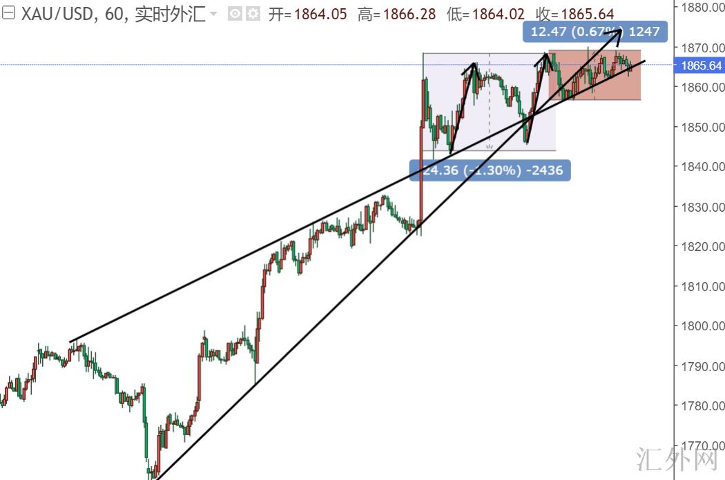 首先解释一下,这不是个上升三角形,底沿是标准此次的上涨趋势线,不管是非农阶段的回踩依旧CPI当天的回踩,差不多都很到位,所以我把它做了一条延申,你会发现从底部开始每次的推涨均为大涨,这在今年史无前例,但不能由于这样你就要认为牛市来了,由于牛市的分析标准太多了,连续的买单和有好处空头反涨的动作,让黄金价格连续三轮涨到了1868,再加之最后的K线收影回踩40,其实这个动作我很关注,由于显著就是主力退场的举动。