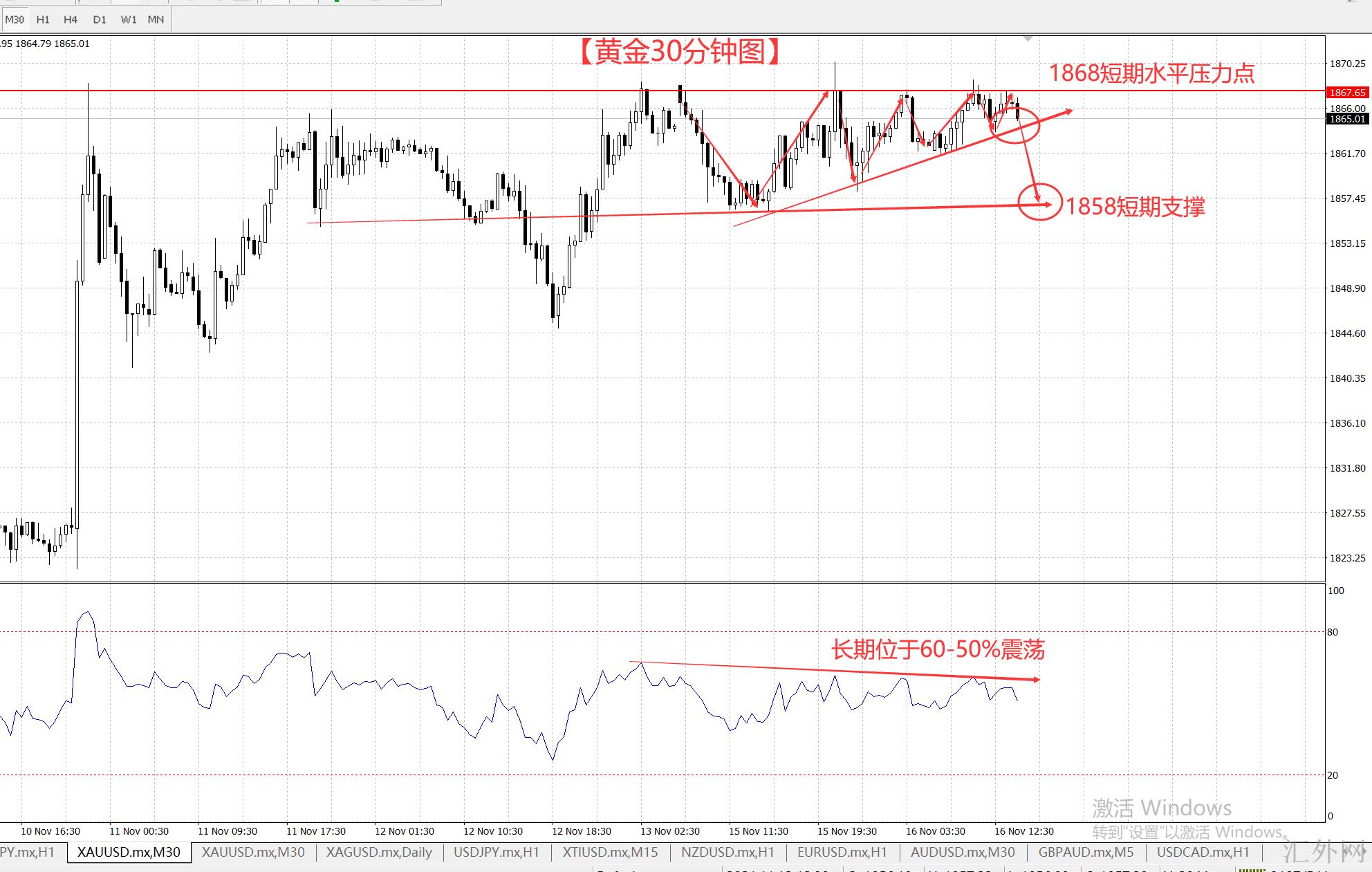 短时间的黄金已经深陷到了一个阴阳怪气的行情中很难自拔。30分钟的黄金来说,自从上星期三夜里CPI报告发布后面,冲顶到1868,到迄今为止,一直处在震荡中走不出来,上方持续遇阻于1868一线,先后两轮回撤都没能顺遂走跌,而是不间断的试探1868。