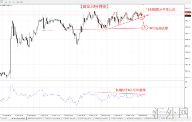 短时间的黄金已经深陷到了一个阴阳怪气的行情中很难自拔。30分钟的黄金来说,自从上星期三夜里CPI报告发布后面,冲顶到1868,到迄今为止,一直处在震荡中走不出来,上方持续遇阻于1868一线,先后两轮回撤都没能顺遂走跌,而是不间断的试探1868。