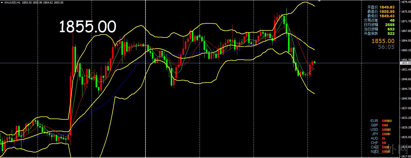 黄金昨天最高1877一线按计划下挫,最低跌向1849左右,日K线收长上影阴线。