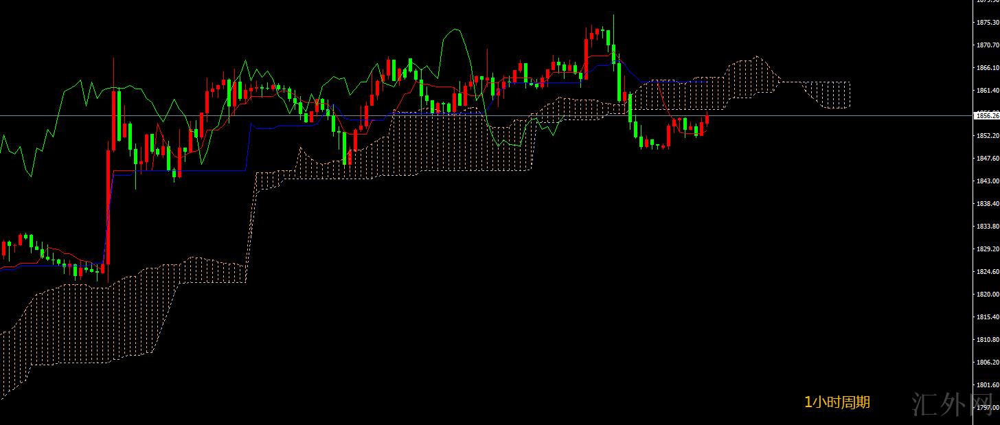 在行情朝下击穿1小时云层支撑后面,我们留心今夜美盘的卖方发力情形,可在1小时云层带抑制位买跌,下看4小时周期的支持点。即1858-62布局空单,止损放置于30分钟及1小时云层上沿重叠处上方,即1863上方。
