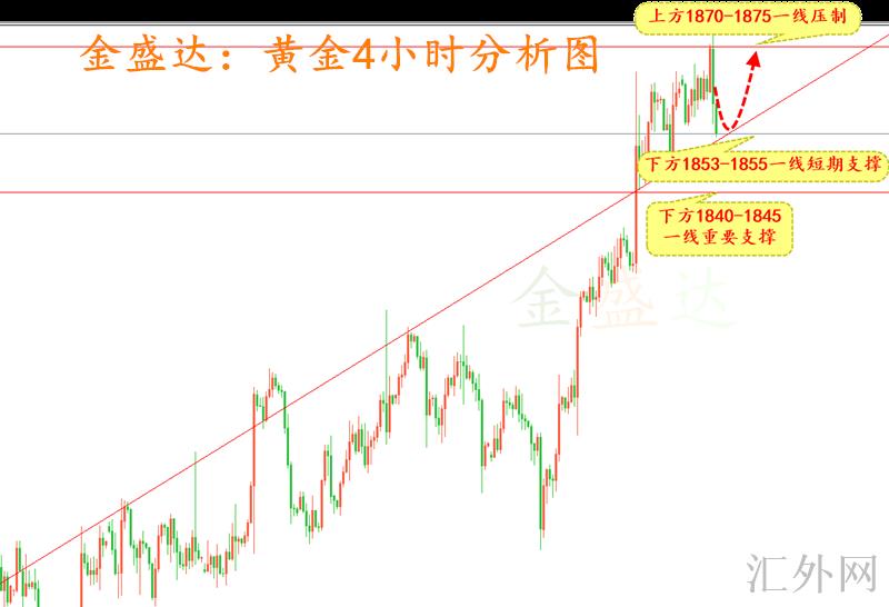 上图可以看出,尽管当前买方比较强劲,但是以下依旧是注意1853-1855一线支撑点置,假使此位置被击破,后市趋势就已经反转,否则买方仍有机会持续抬头,当前操作上金盛达推荐着重关注以下1840-1845一线支撑,上方1875-1870一线短时间抑制,手里有持仓的朋友可以及时与我沟通交流,金盛达为你供应许多操作方案!