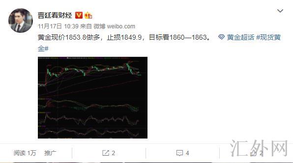 星期三(11月17号)黄金开盘于1850.2美元每盎司,开盘后适当回踩到1849.7美元每盎司回弹,晋廷给出的1853现价多单也成功止盈,纽约时段创下日间高位到1868.0美元每盎司,最终收盘于1867.7美元每盎司,上升16.8美元,升幅0.91%,振幅0.99%。
