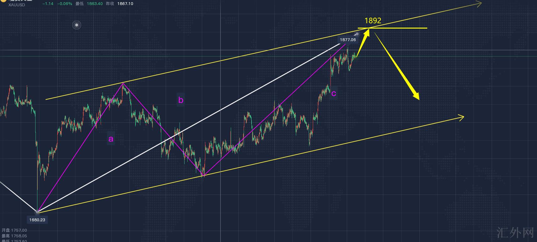 2、小浪分析:如大一级的波浪分析,当前行情处在C-2回弹当中,当前顶部暂不可知。依据已有行情我们可将C-2浪执行细分呈锯齿浪abc结构,如图所示,当前行情已走完a浪(1680-1833)和b浪(1833-1720)。依据波浪理论推演:c浪一般等长于a浪,故理想的c浪顶部位于1873左右。当前行情最高企及1877一线,已差不多符合c浪顶部位置!但a浪起点和b浪终点的连接线理论上需平行于a浪终点和c浪终点连接线,如图中黄色箭头线所示,我们可知行情仍有上升空间!